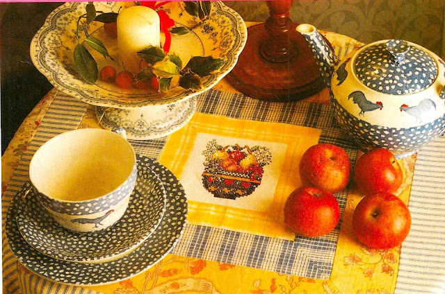 Una tovaglia patchwork con il cesto della frutta al centro a punto croce